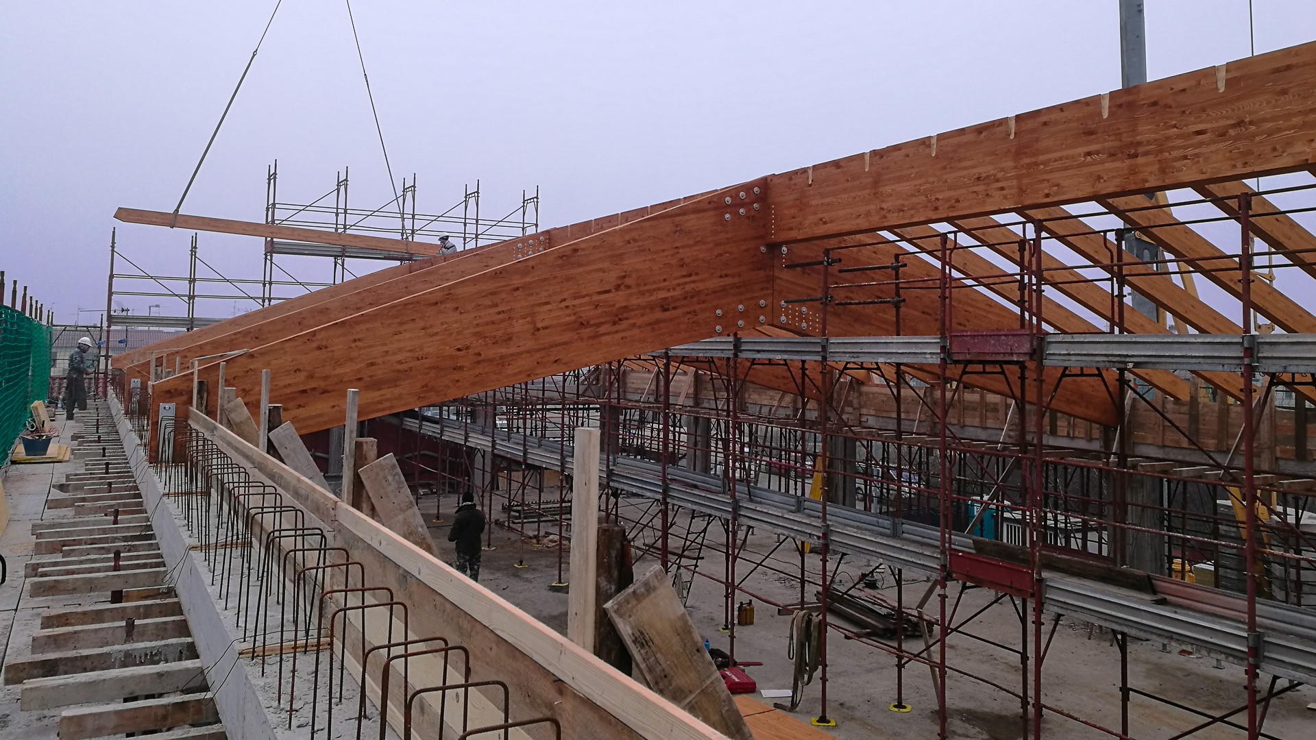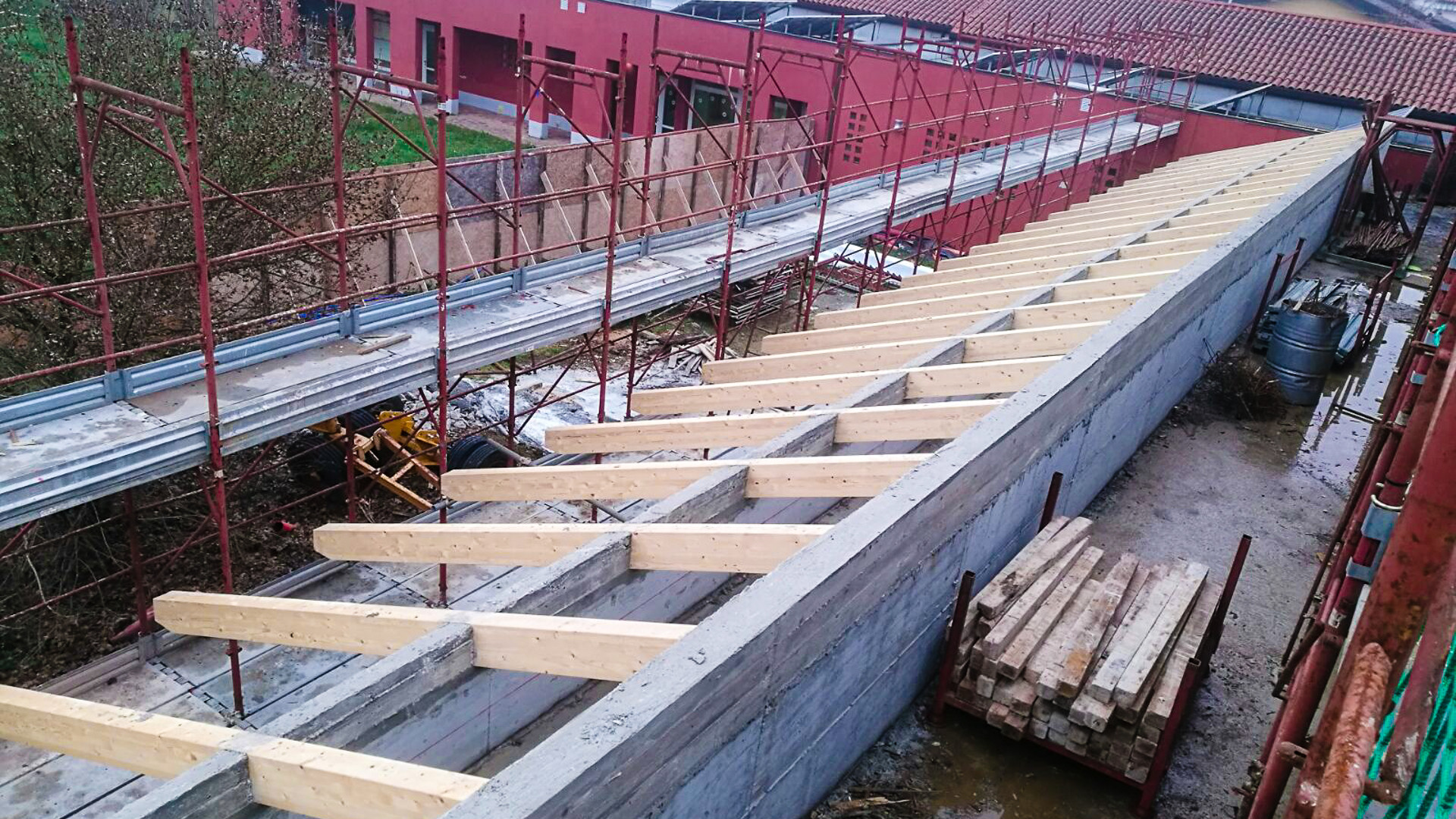 La divisione Legno di BCM srl ha fornito e realizzato la copertura di un edificio scolastico di costituita da una struttura in legno lamellare a vista, con portali a giunto rigido,